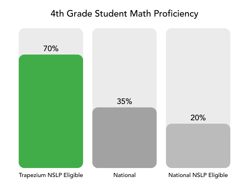 In a single school study where 100% of the students were National School Lunch Program (NSLP) eligible and Trapezium Math was the core curriculum, 70% percent of students scored at or above grade-level proficiency year over year for 12 years running.